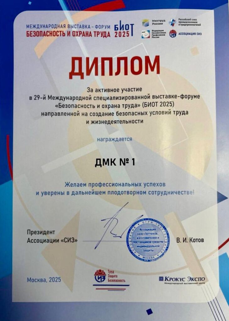По итогам работы компания «ДМК №1» была отмечена организаторами и награждена дипломом за активное участие и весомый вклад в развитие сферы охраны труда.
