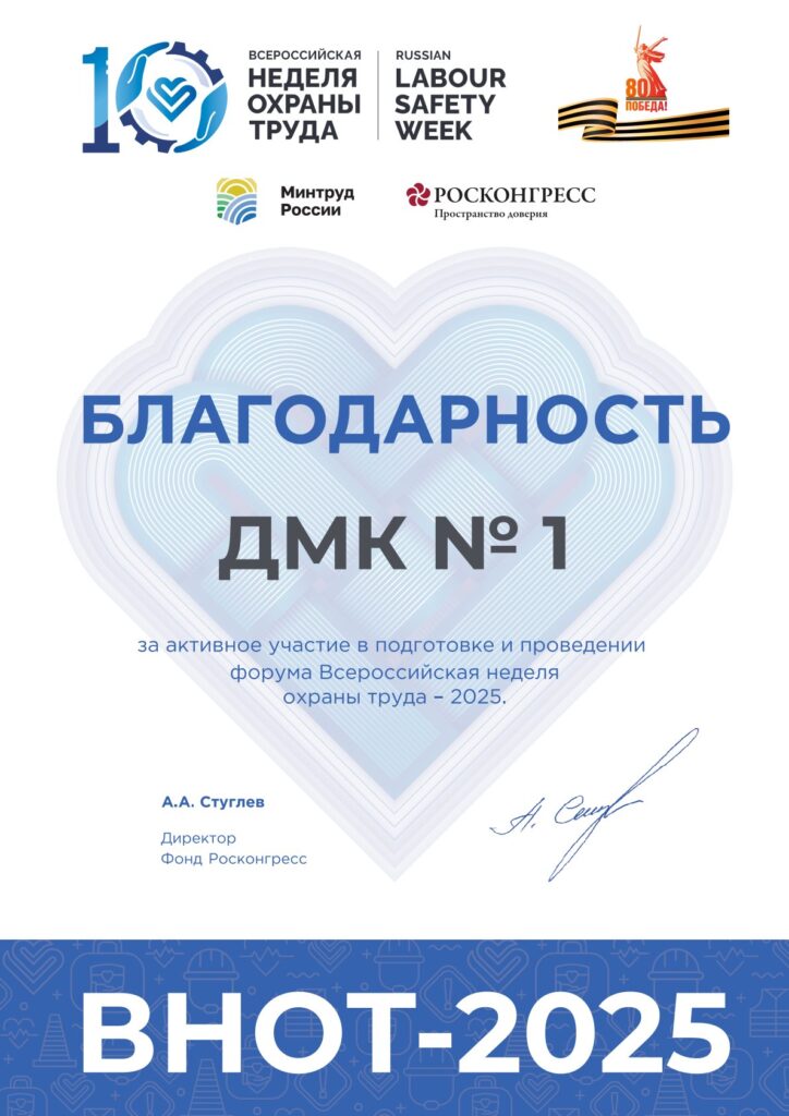 ДМК №1 выражает искреннюю благодарность организаторам ВНОТ за высокий уровень проведения мероприятия и создание эффективной площадки для профессионального диалога. Организаторы также поблагодарили участников ДМК №1 за активное участие в подготовке и проведении форума Всероссийская неделя охраны труда – 2005.